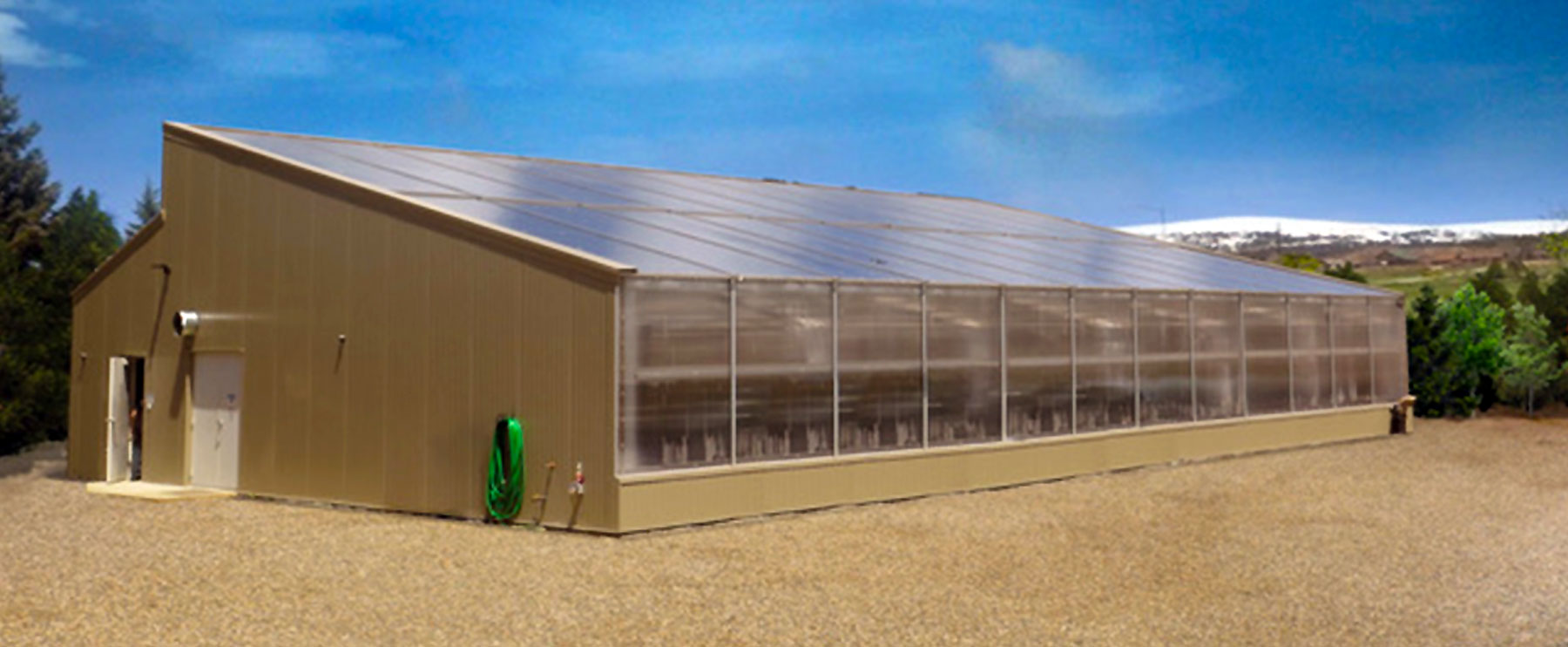 The wall panels of the north side of the greenhouse are made from insulated metal with an R-value of 20, providing superior insulation in harsh climates. Growers in cold climates have the option to add this insulation to the east- and west- facing walls as well. The south-facing wall is glass in order to best utilize natural sunlight. Additionally, the roof slope on the southern side of the building is very long in order to maximize sun exposure. The short side of the roof is where the EzGro Tri-Helix Solar Windmill will be placed.