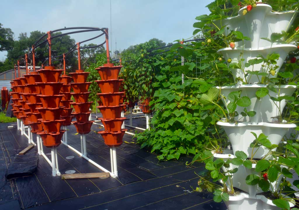 He said it takes 5 gallons of water about a minute to go from the top pot to the bottom — a speed he says assures that nutrients flow equally through each pot.