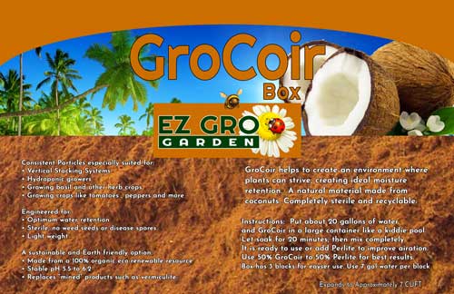 GroCoir is pH balanced and contains low sodium content for coir fiber. It increases water holding capacity and nutrient retention, expanding to 5 times its condensed brick size. GroCoir can be mixed with any other growing media.