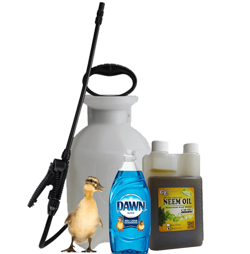 We have found when you mix 1 oz of Neem Oil with 3/4 oz of Dawn dish soap and spray you garden once a week we don’t seem to have the bug and fungus issues you find in most gardens.